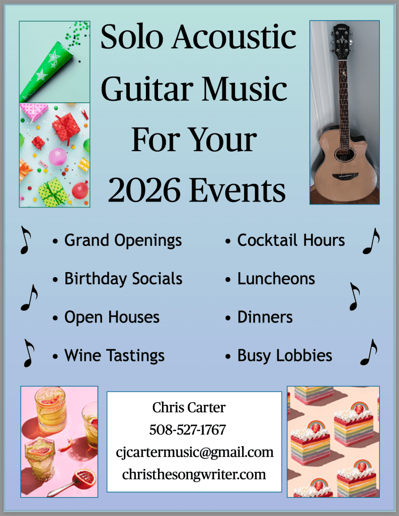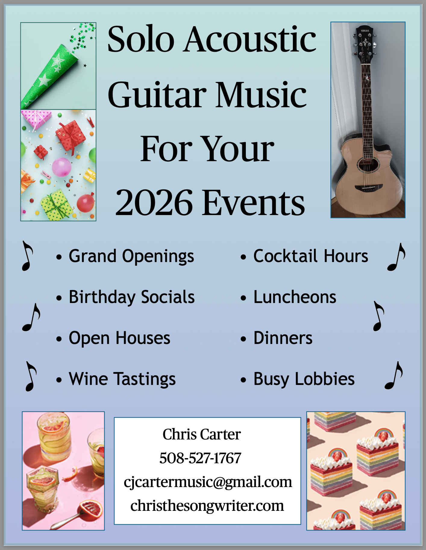 Make your 2026 events more memorable by adding live solo acoustic guitar music! A perfect selection of songs performed at a reasonable volume level so you can enjoy the music while socializing. Book music for your event today!
