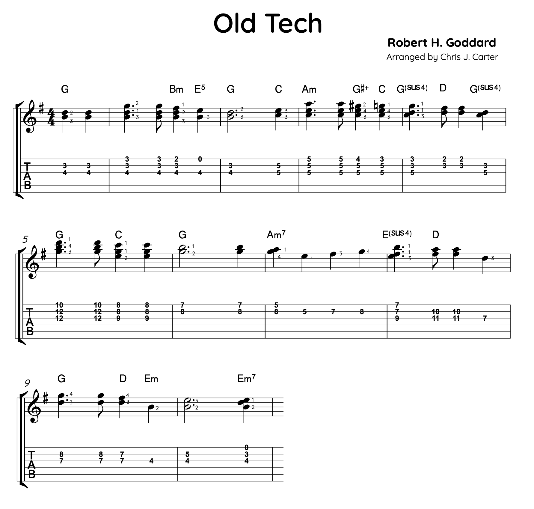 Here’s a partial arrangement of “Old Tech” composed in 1908 by the inventor, Robert H. Goddard. A friend of mine texted me the piano sheet music yesterday. It’s impossible to play all the parts on guitar, so I just focused on arranging the treble clef part.